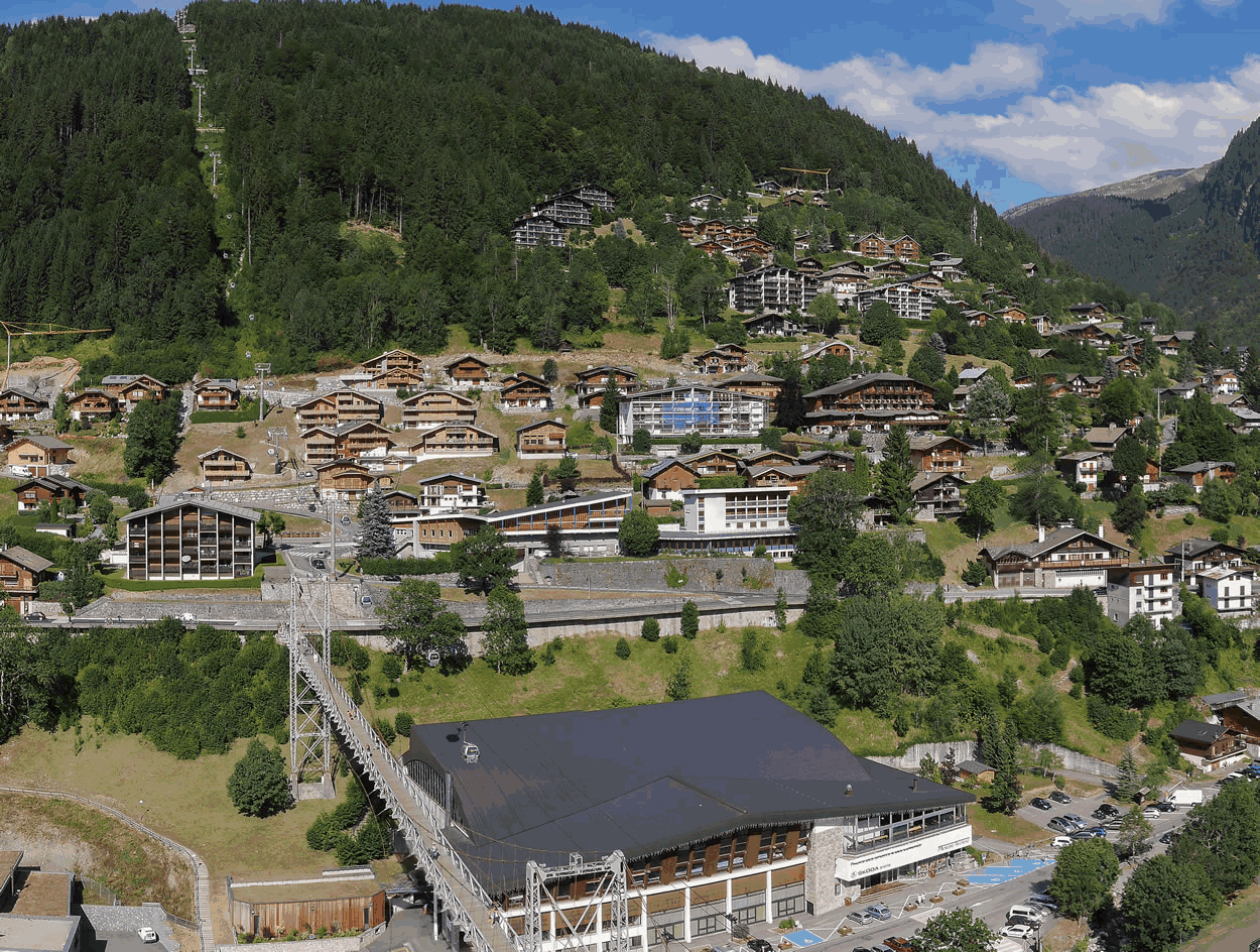 La passerelle, enjambant la vallée, mène jusque au télécabine de Super Morzine rejoignant les pistes d’Avoriaz.